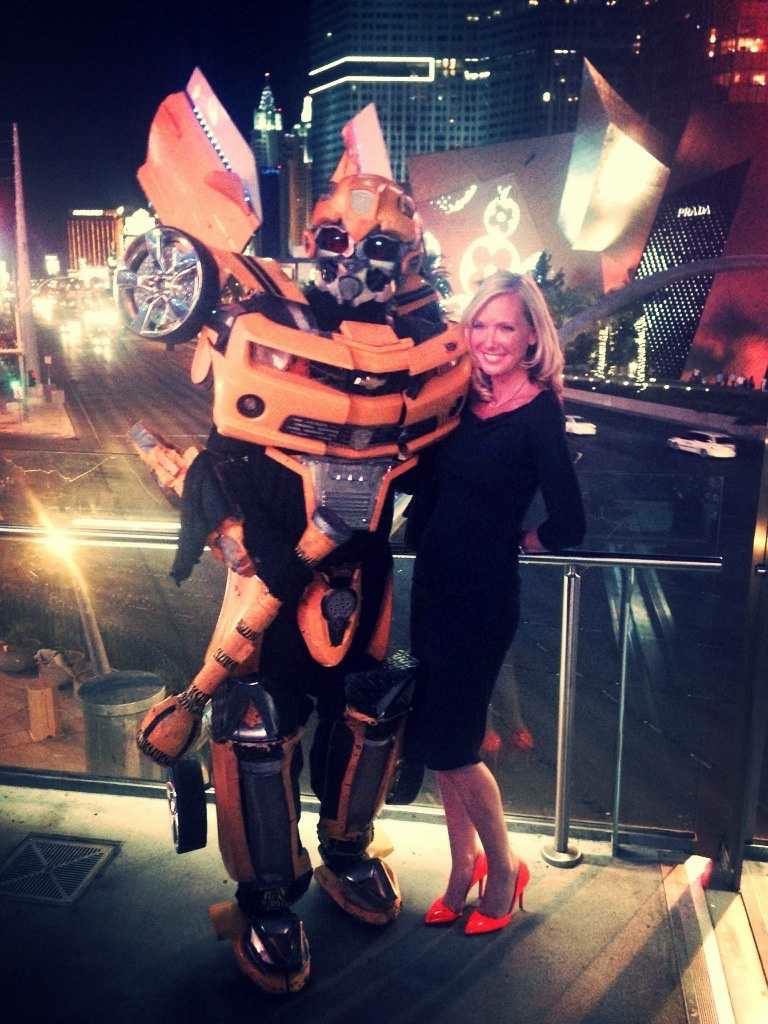 Here, I’m wearing a Vivienne Westwood Anglomania navy dress.  It’s fairly simple (although Vivienne Westwood does some amazing draping that provides shape without being too tight in the wrong places), but what I think makes this outfit work in Vegas are the neon orange McQ by Alexander McQueen shoes.  I think they’re impossible not to notice, even when standing next to Bumblebee from the Transformers.  And they suggest a sense of fun and a willingness to take risks, which I think is always sexy.